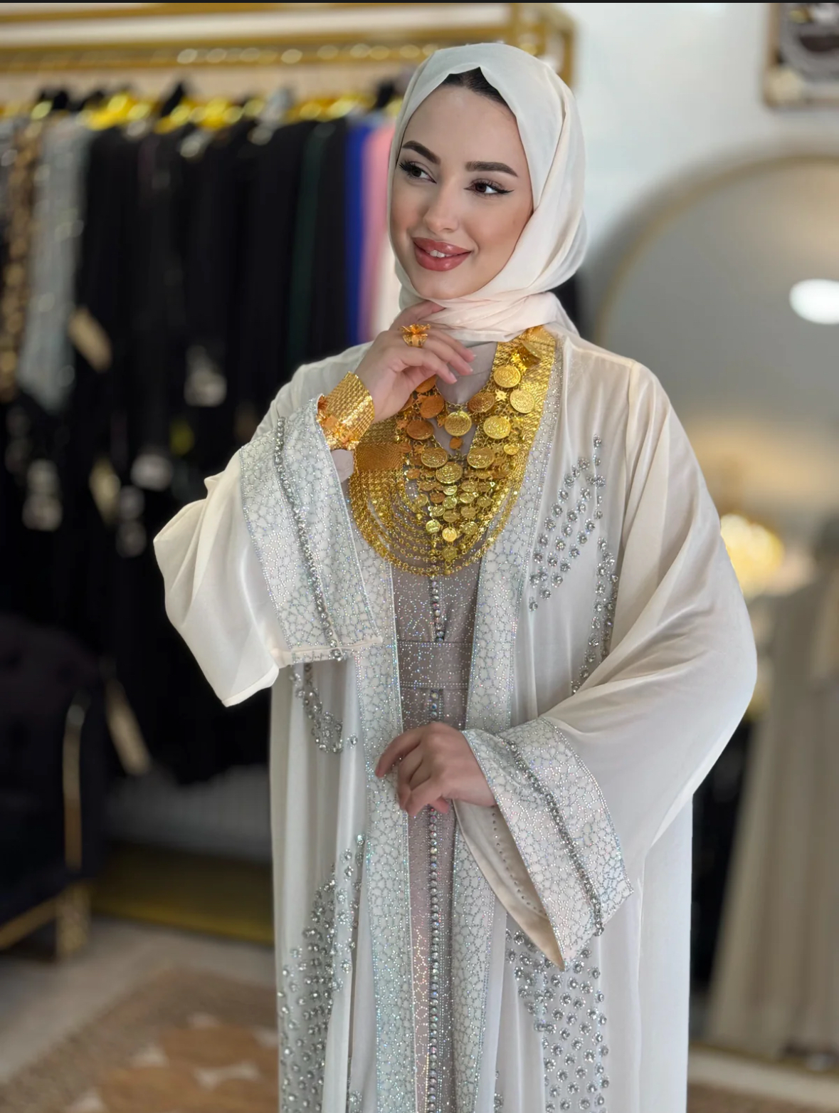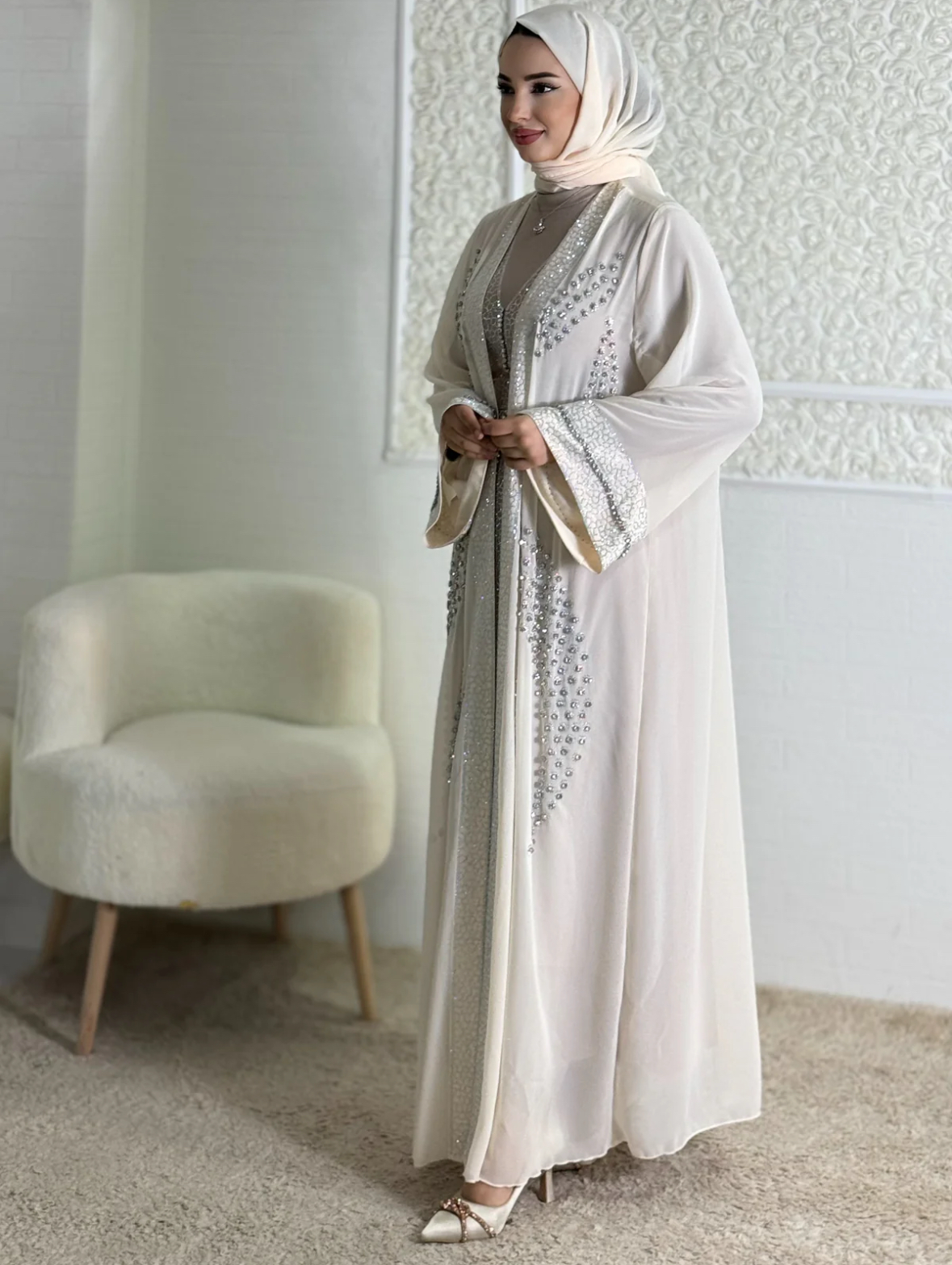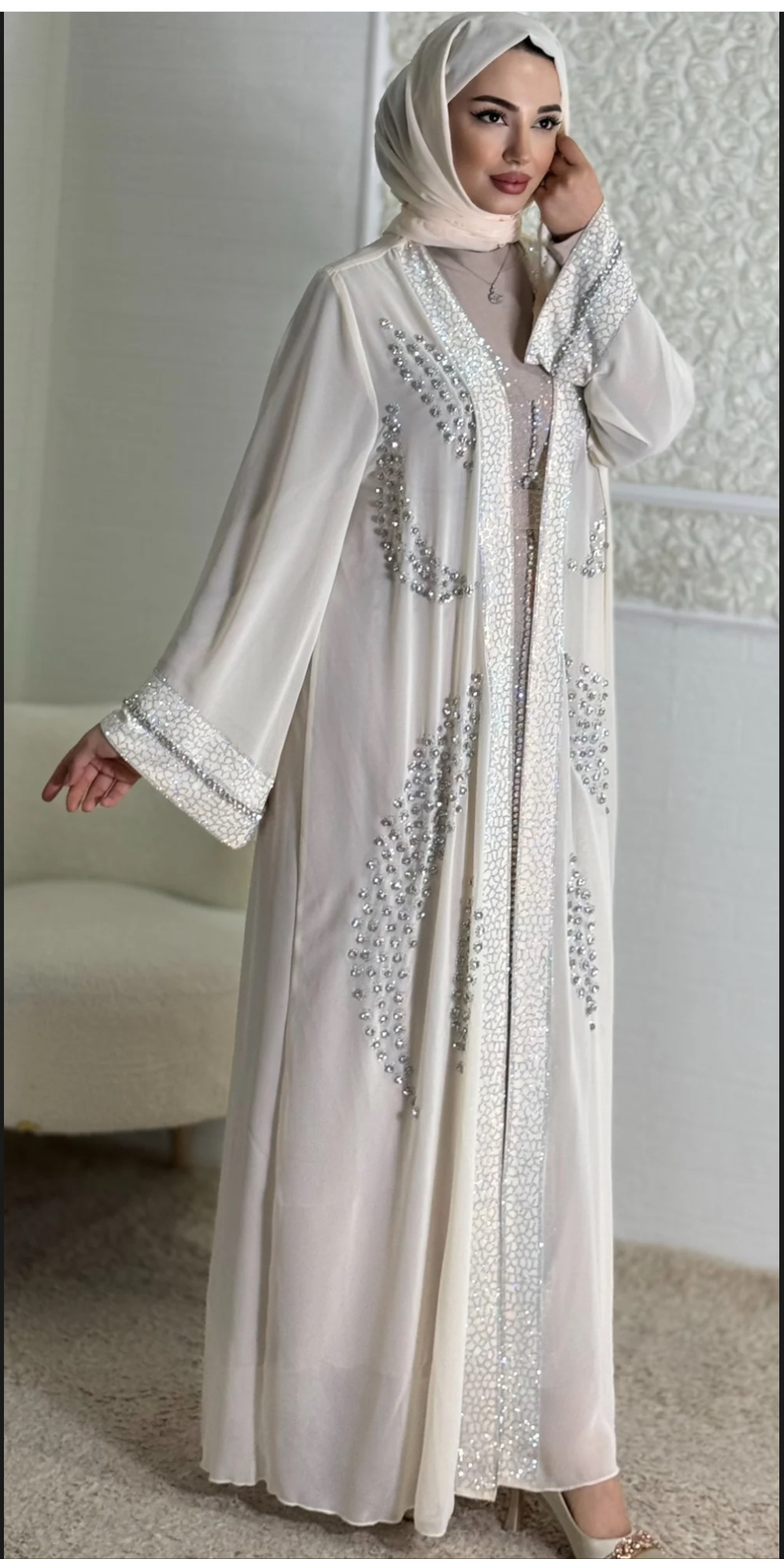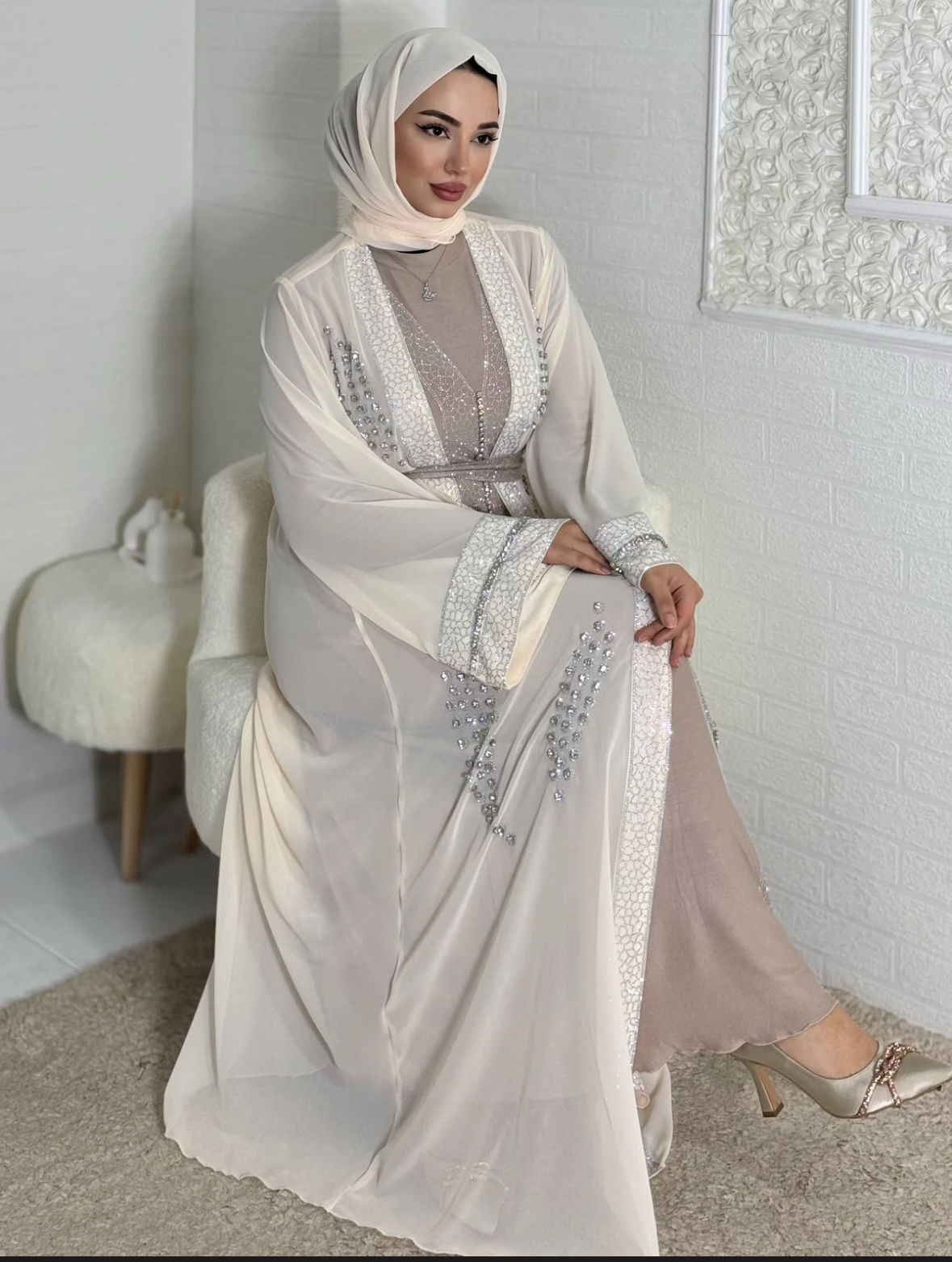 Luxury Stones Embroidered Cream Abaya